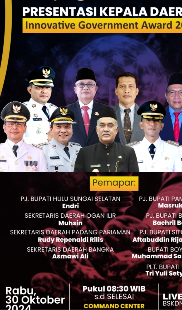 Hal itu diungkap Sekretaris Daerah Padang Pariaman Rudy Repenaldi Rilis sesaat sebelum mempresentasikan berbagai inovasi unggulan Padang Pariaman di hadapan Tim Penilai Penganugerahan Inovasi Government Award Tahun 2024, Kementerian Dalam Negeri RI, pada acara Rapat Koordinasi Presentasi Kepala Daerah dalam rangka penganugerahan IGA Award Tahun 2024 yang dilaksankan di Ruang Command Centre BSKDN Kementerian Dalam Negeri Pada hari ini, Rabu 30 Oktober 2024.