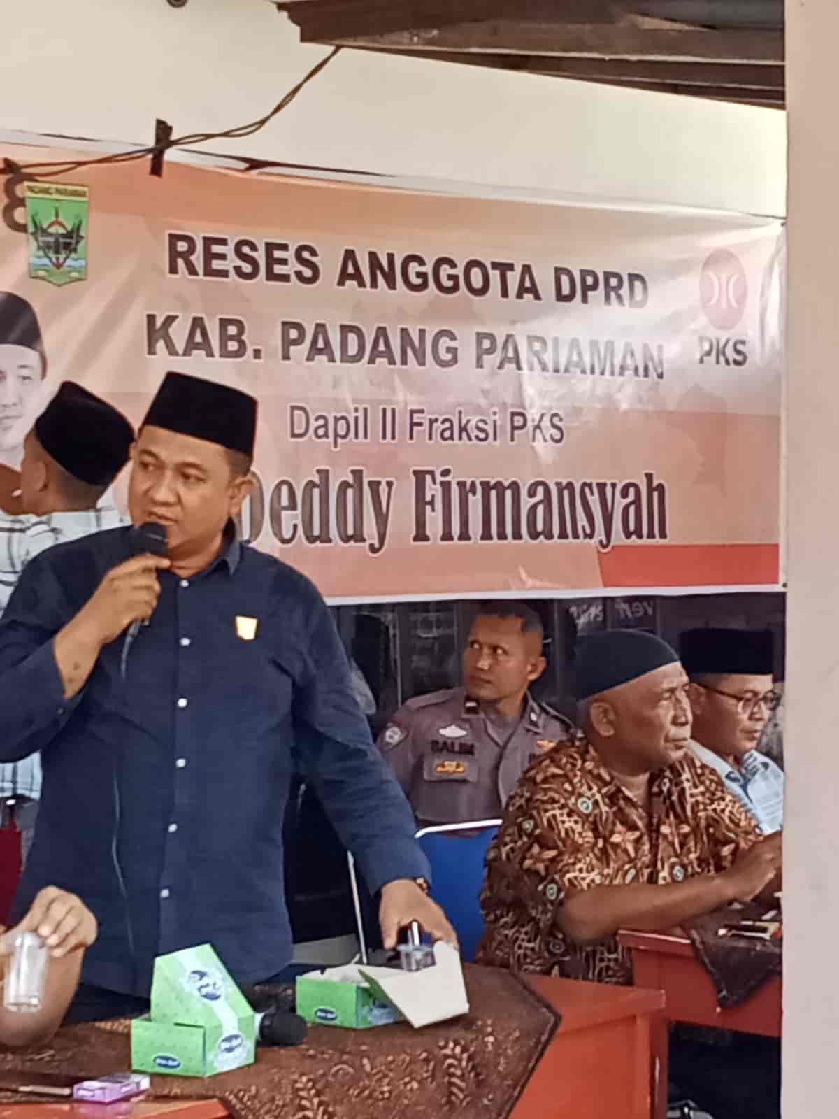 Dalam kegiatan reses anggota dewan kab padang pariaman untuk yang pertama kalinya menerima masukan masukan dari masyarakat setempat dengan agenda penyampaian wujud kepedulian anggota Dewan terhadap mesyarakat di dapilnya masing masing .Disini St Dedy Firmansyah SH selaku penerima semua masukan baik dalam pembangunan infratrukstur maupun dalam pemberdayaan masyarakat nanti nya agar bisa menyampaikan dengan apa yang diusulkan agar dapat terwujudnya rencana pembangunan yang bermanfaat buat masyarakat banyak.