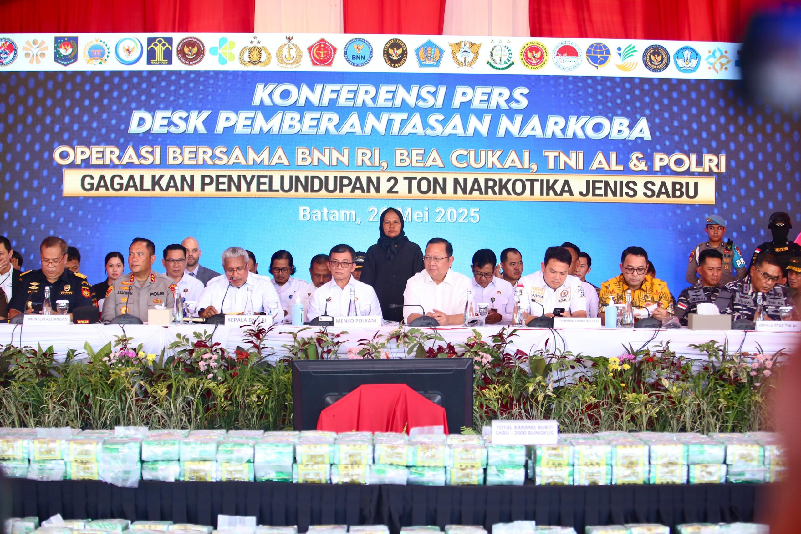Konferensi Pers ini dipimpin langsung oleh Kepala BNN RI Komjen Pol. Dr. Marthinus Hukom, S.I.K., M.Si., dan diikuti oleh Wakil Ketua Komisi III DPR RI Bpk. Dede Indra Permana, S.H., M.H., Anggota Komisi III DPR RI Bpk. Sudin dan Bpk. Pulung Agustanto, Menteri Koordinator Politik dan Keamanan yang diwakili oleh Sekretaris Menkopolhukam Bpk. Letjen TNI Mochammad Hasan, Panglima TNI yang diwakili oleh Asintel Kaskogabwilhan Bpk. Brigjen TNI Jimmy Watuseke, S.E., Jaksa Agung RI yang diwakili oleh Kajati Kepri Bpk. Teguh Subroto, S.H., M.H., Menteri Keuangan yang diwakili oleh Direktur Interdiksi Narkotika Bea Cukai Bpk. R. Syarif Hidayat, Menteri Hukum dan HAM yang diwakili oleh Kakanwil Kemenkumham Kepri Bpk. Edison Manik, Menteri Imigrasi yang diwakili oleh Kakanwil Ditjen Imigrasi Kepri Bpk. Ujo Sujoto, S.H., M.Si., Menteri HAM yang diwakili oleh Dirjen Pelayanan dan Kepatuhan HAM Bpk. Munafrizal Manan, S.H., S.Sos., LL.M., M.IP., M.Si., Menteri PPMI/Kepala BP2MI yang diwakili oleh Kepala BP3MI Kepri Bpk. Kombes Pol. Imam Riyadi, S.I.K., M.H., Kepala Badan Intelijen Negara yang diwakili oleh Kabinda Provinsi Kepri Bpk. Brigjen TNI Bonar Panjaitan, S.E., M.Si., Kepala Staf TNI Angkatan Laut yang diwakili oleh Pangkoarmada I Bpk. Laksda TNI Fauzi, S.E., M.M., M.Tr. Opsla, M.Han, Kepala PPATK yang diwakili oleh Direktur Strategi dan Kerja Sama Dalam Negeri Bpk. Brigjen Pol. Mochammad Irhamni, Pejabat Utama Polda Kepri, perwakilan DEA Bangkok yakni Mr. Marc Laing dan Ms. Apiradee Pleekam, serta DEA Jakarta yakni Mr. Andrew Hsia, perwakilan NSB Thailand Pol. Col. Witoon Yanukul, perwakilan ONCB Thailand yakni Mr. Chanyut Kamla, Mr. Suphachok Pothong, dan Miss Suthinee Techawong, para Pejabat Tinggi Madya dan Pratama BNN RI, pimpinan pemerintah daerah dan anggota Forkopimda Provinsi Kepri, para pimpinan instansi vertikal di Provinsi Kepri, penasihat dan kelompok ahli BNN yakni Bpk. Gories Mere, Habib Zein Assegaf (Habib Kribo), Cak Islah Bahrawi, Bpk. Akbar Faisal, Bpk. Ecep Suryadiniyasa, dan Bpk. Eduardus Lemanto, serta para tokoh agama, tokoh adat, dan tokoh masyarakat Kepulauan Riau.