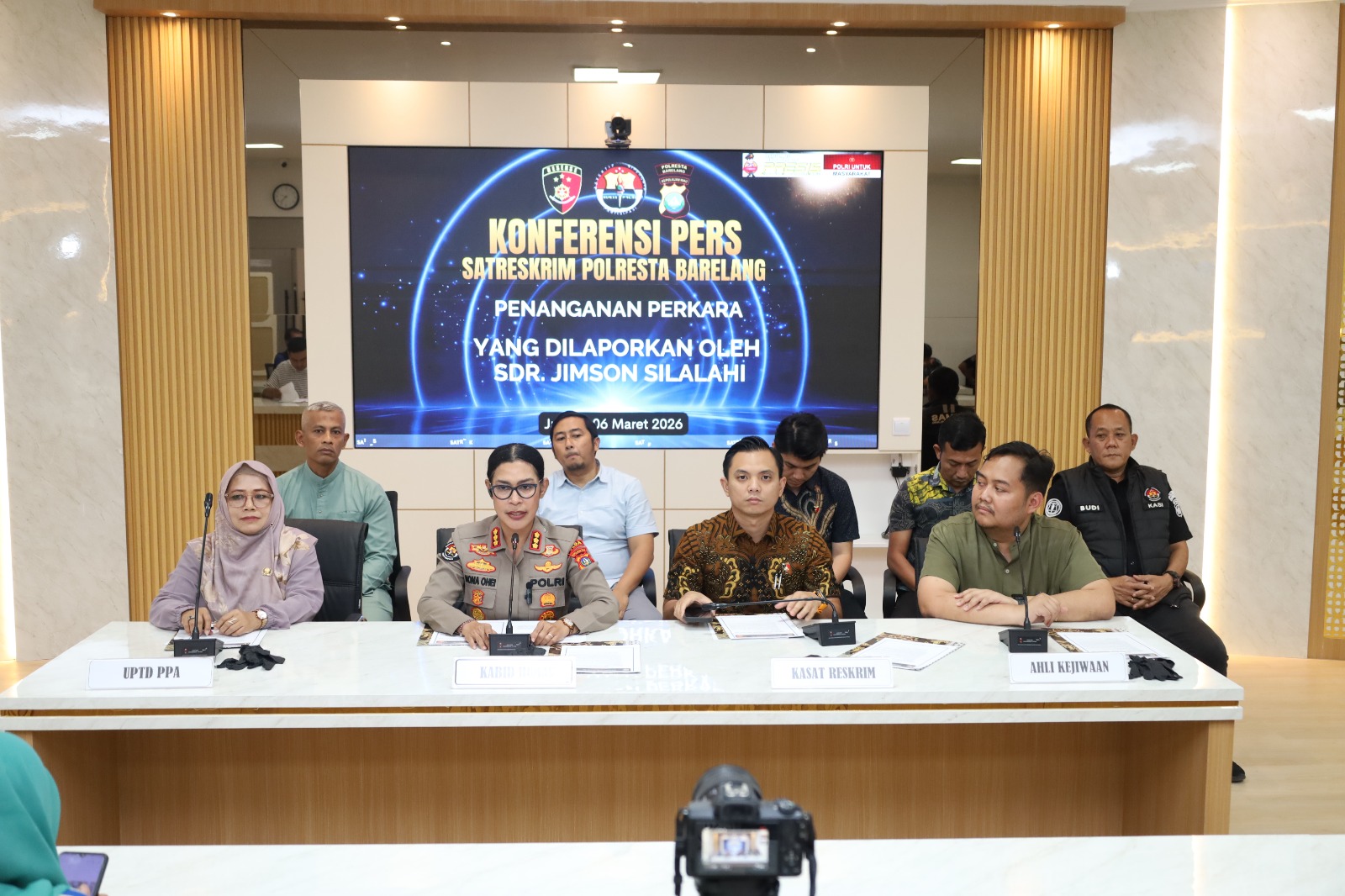 ​Konferensi pers ini dipimpin langsung oleh Kabid Humas Polda Kepri Kombes. Pol. Dr. Nona Pricillia Ohei, S.I.K., S.H., M.H., dengan diikuti oleh Kasat Reskrim Polresta Barelang Kompol M. Debby Tri Andrestian, S.I.K., M.H. Li., Kasihumas Polresta Barelang AKP Budi Santosa, S.H., Kanit Reskrim Polsek Batam Kota Iptu Bobby Ramadhana Fauzi, S.H., M.H., Kanit III Sat Reskrim Polresta Barelang AKP Muhammad Ridho, S.H, serta Kanit PPA Polresta Barelang Iptu Eko Kurniawan, S.Tr.K., S.I.K., M.M. Turut hadir memberikan kesaksian ahli secara langsung maupun melalui video conference (Zoom) yaitu dr. Jhonny Prambudi Batong, Sp.Kj (Ahli Psikiatri Forensik), Mariana M.Psi (Ahli Psikologi), DR. Ahmad Sofian, S.H., M.A (Ahli Hukum Pidana), serta Ibu Suratin, Amd.Keb dari UPTD PPA.