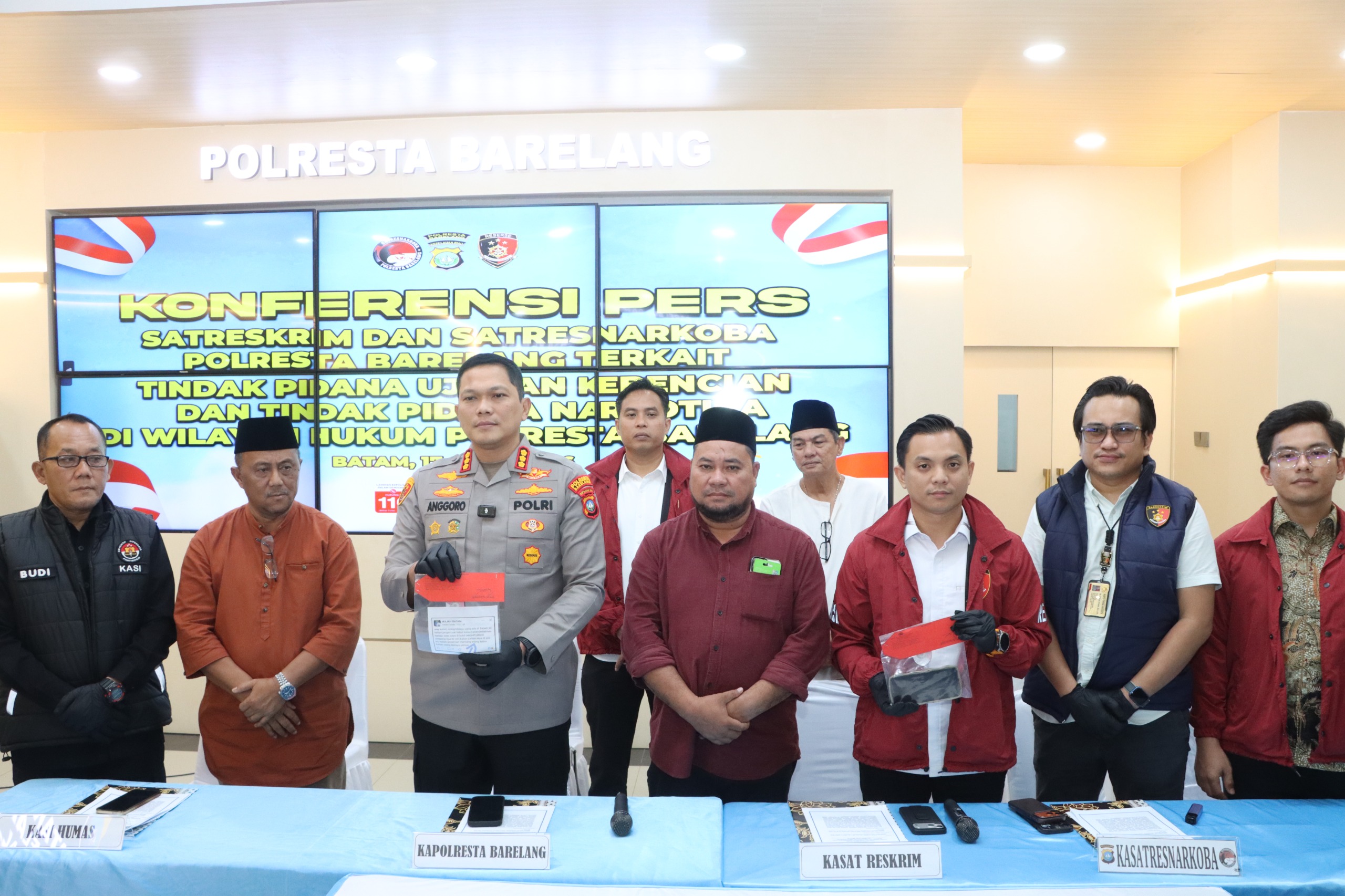 Batam, tbntimes.com – melalui Satuan Reserse Kriminal (Satreskrim) menggelar konferensi pers terkait pengungkapan tindak pidana ujaran kebencian yang terjadi di wilayah hukum Polresta Barelang. Kegiatan tersebut dilaksanakan di Lobby Polresta Barelang dan dipimpin langsung oleh Kapolresta Barelang Kombes Pol Anggoro Wicaksono, S.H., S.I.K., M.H., didampingi Kasat Reskrim Polresta Barelang Kompol M. Debby Tri Andrestian, S.I.K., M.H.Li, Kasat Resnarkoba Kompol Arsyad Riyandi, S.IP., M.H., Kasihumas Polresta Barelang AKP Budi Santosa, S.H., serta Kanit V Tipidter Satreskrim Polresta Barelang Iptu M. Alvin Royantara, S.Tr.K., M.H., Jumat, (17/04/2026).